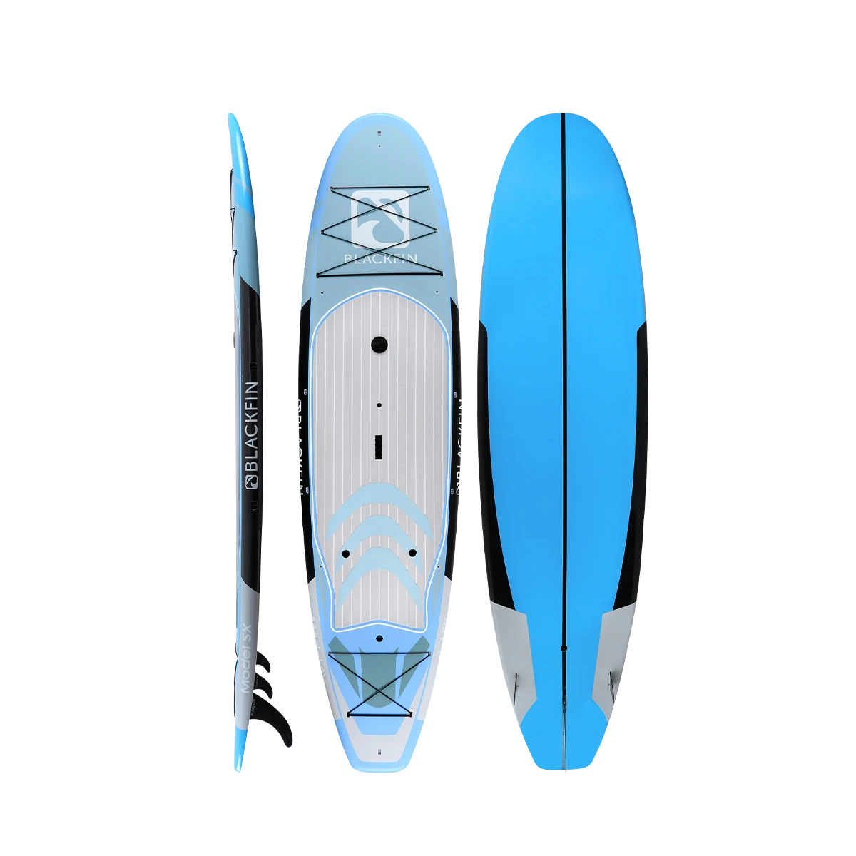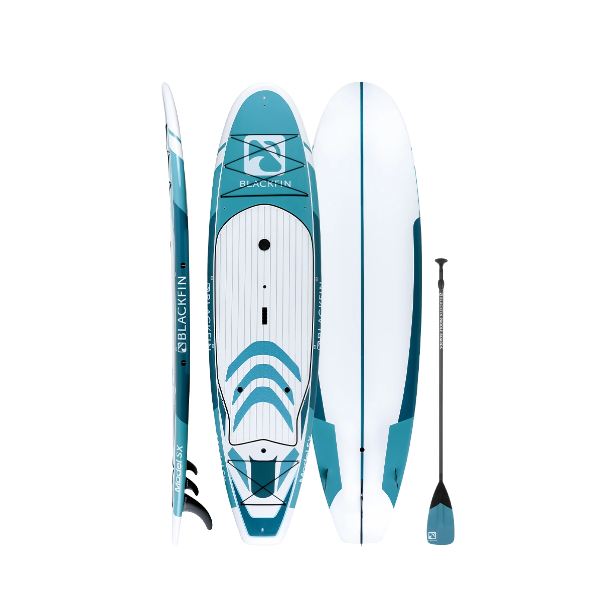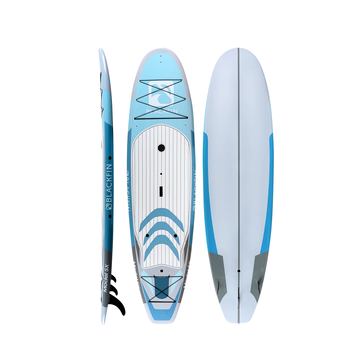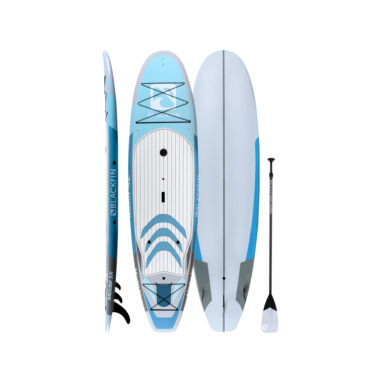 The BLACKFIN Model SX is our first performance Hard Board. Standing 10’6″, the SX is designed for novice to intermediate skill level riders, providing a stable, smooth ride. The 32″ of width provides good stability for calm or choppy waters, while still maintaining a fast design to glide through the water with minimal drag. Great for the rider who is looking for extra stability while maintaining performance. This board is also equipped with a front and rear cargo bungee area for storage, an ultra-comfortable logo stamped deckpad, a dual sided center carry handle as well as side rail clips for our signature carry strap, for easy transport. We have also added a center console dry box / cup holder for your valuables or beverages on those hot sunny days and built in kayak seat clips for our kayak bundles. An all-around great board for anyone looking to advance their SUP skills to the next level and enjoy the same quality construction that is consistent with the BLACKFIN brand.
