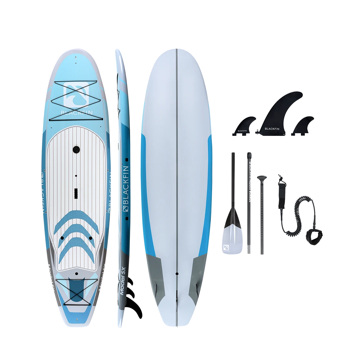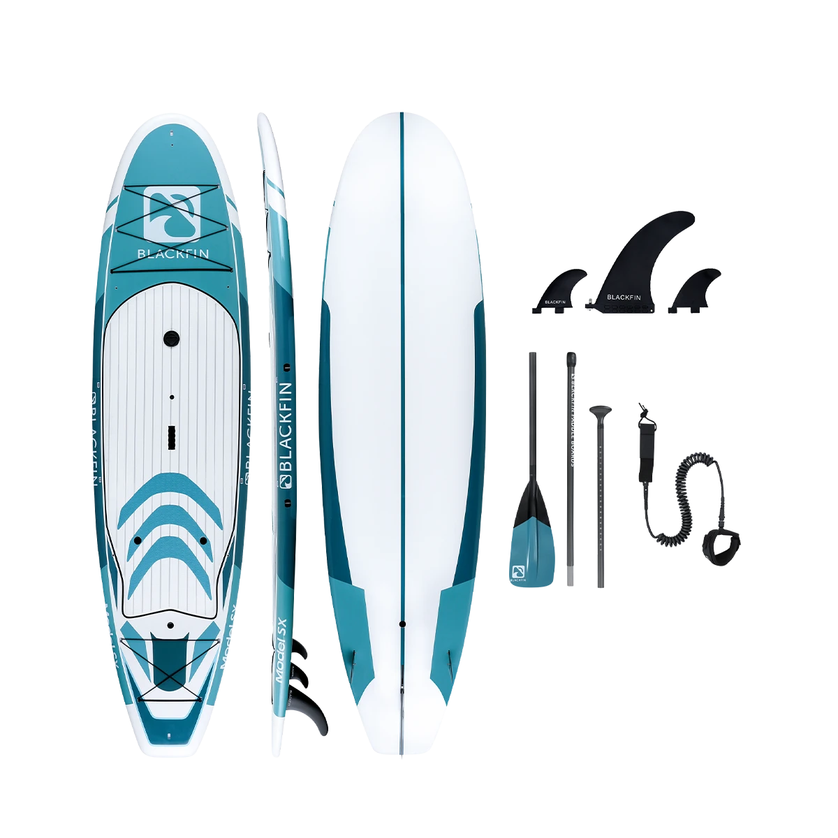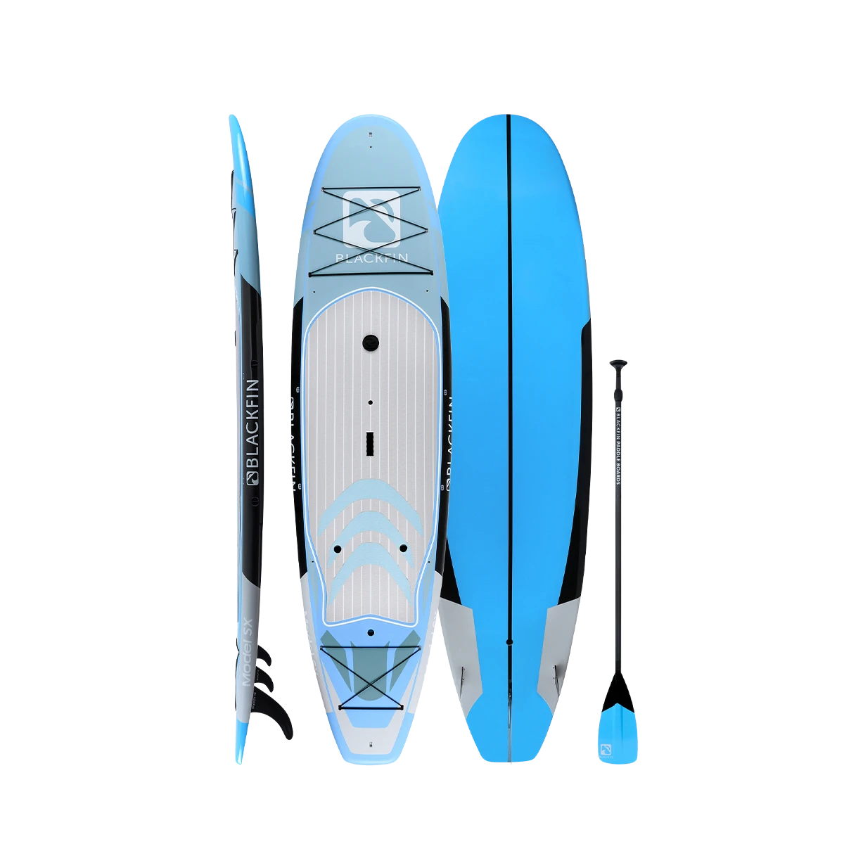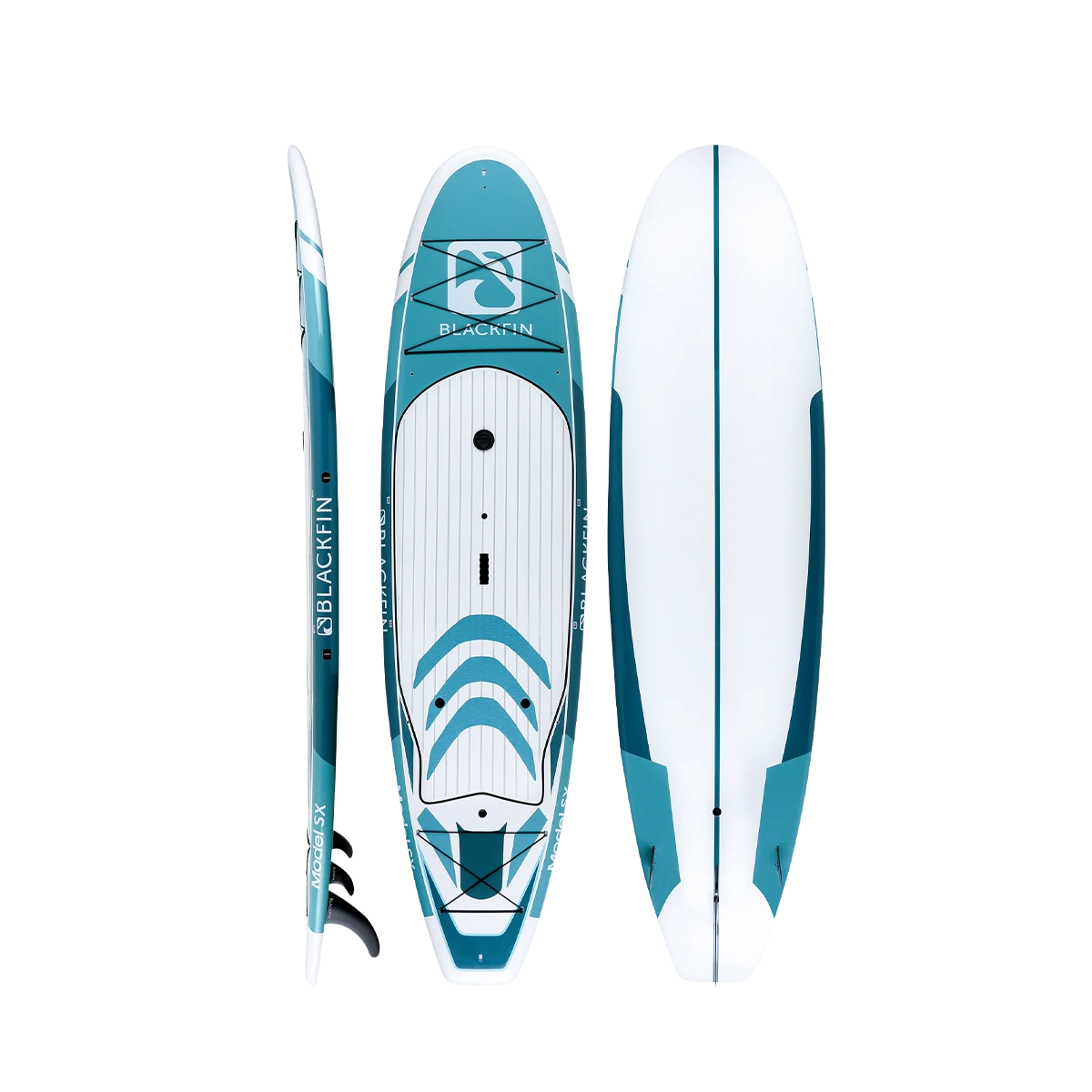 The BLACKFIN Model SX is our first performance Hard Board. Standing 10’6″, the SX is designed for novice to intermediate skill level riders, providing a stable, smooth ride. The 32″ of width provides good stability for calm or choppy waters, while still maintaining a fast design to glide through the water with minimal drag. Great for the rider who is looking for extra stability while maintaining performance. This board is also equipped with a front and rear cargo bungee area for storage, an ultra-comfortable logo stamped deckpad, a dual sided center carry handle as well as side rail clips for our signature carry strap, for easy transport. We have also added a center console dry box / cup holder for your valuables or beverages on those hot sunny days and built in kayak seat clips for our kayak bundles. An all-around great board for anyone looking to advance their SUP skills to the next level and enjoy the same quality construction that is consistent with the BLACKFIN brand.