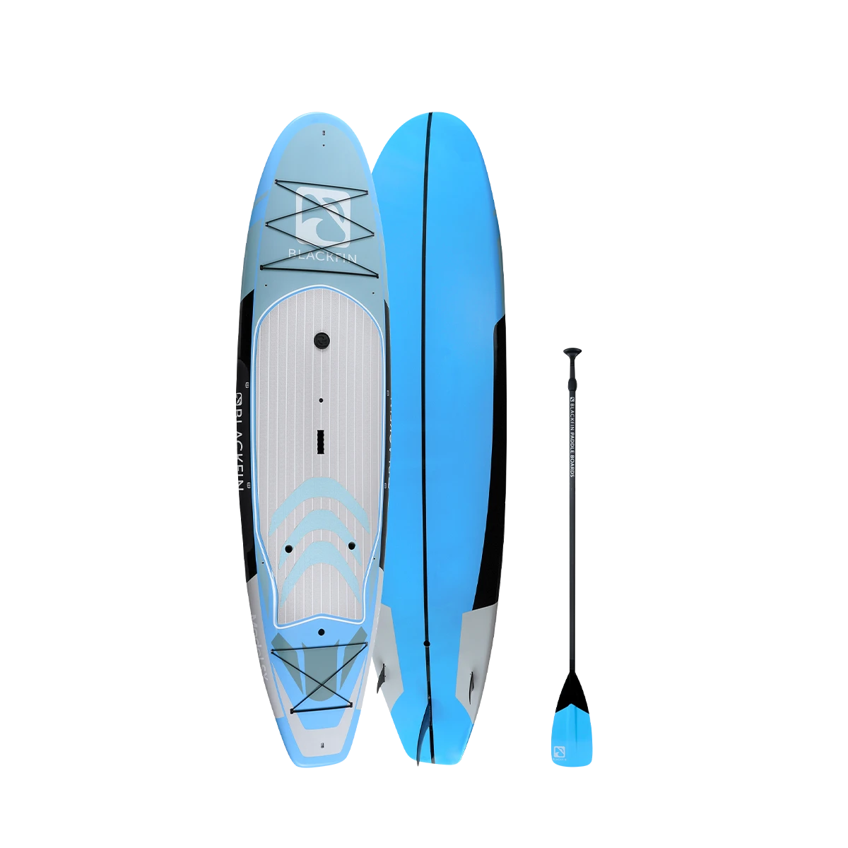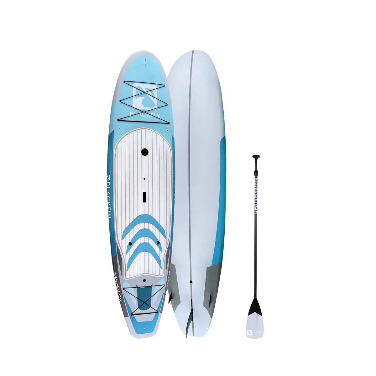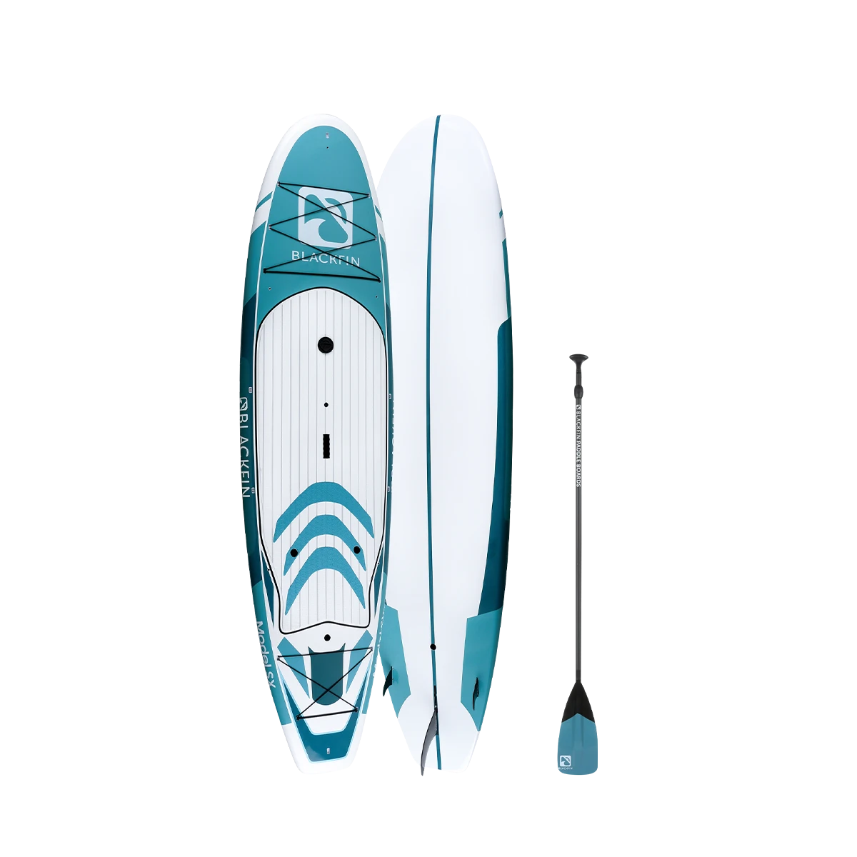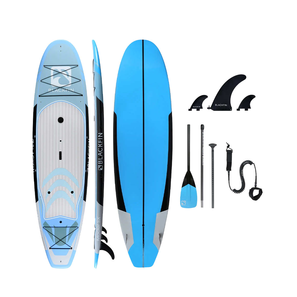 The BLACKFIN Model SX is our first performance Hard Board. Standing 10’6″, the SX is designed for novice to intermediate skill level riders, providing a stable, smooth ride. The 32″ of width provides good stability for calm or choppy waters, while still maintaining a fast design to glide through the water with minimal drag. Great for the rider who is looking for extra stability while maintaining performance. This board is also equipped with a front and rear cargo bungee area for storage, an ultra-comfortable logo stamped deckpad, a dual sided center carry handle as well as side rail clips for our signature carry strap, for easy transport. We have also added a center console dry box / cup holder for your valuables or beverages on those hot sunny days and built in kayak seat clips for our kayak bundles. An all-around great board for anyone looking to advance their SUP skills to the next level and enjoy the same quality construction that is consistent with the BLACKFIN brand.