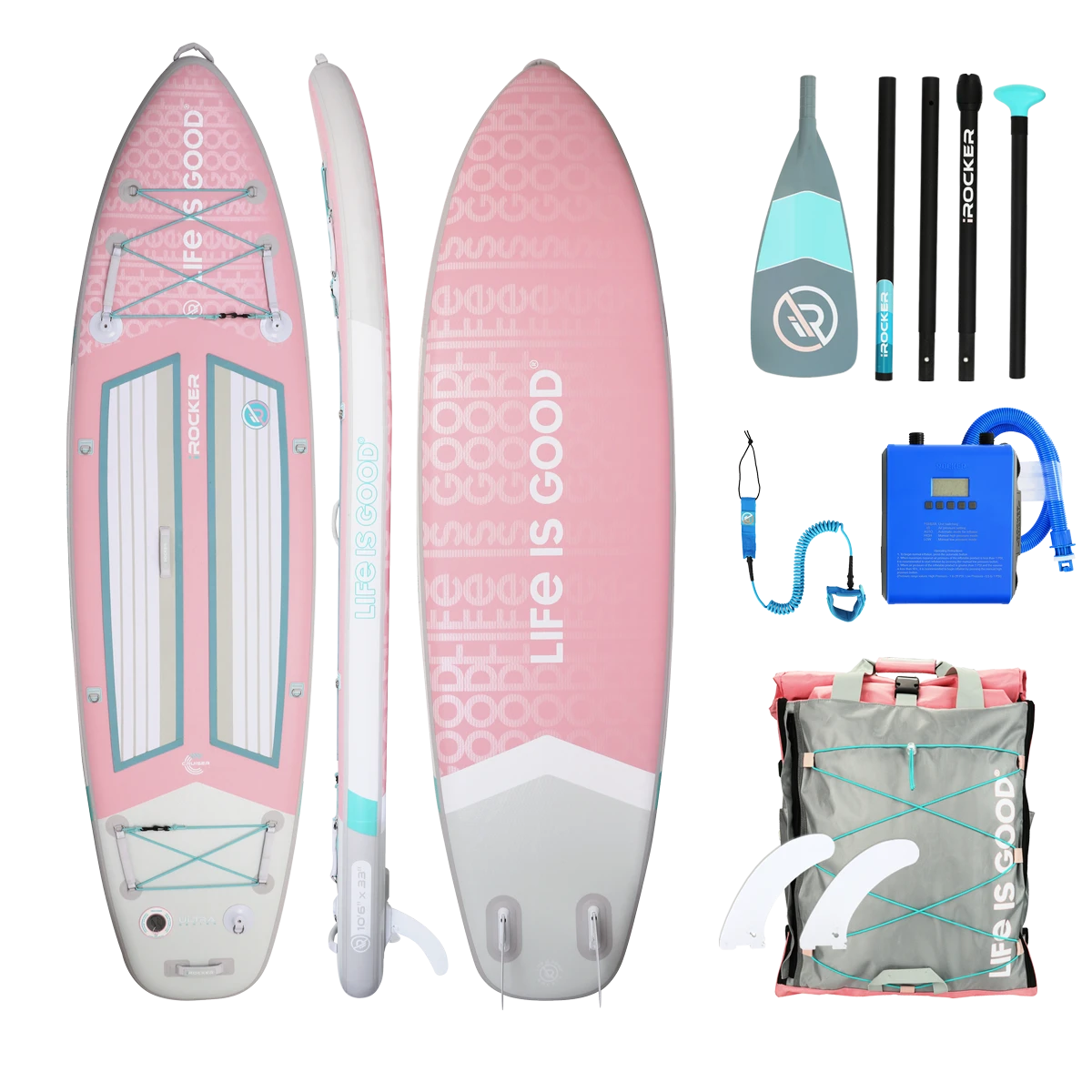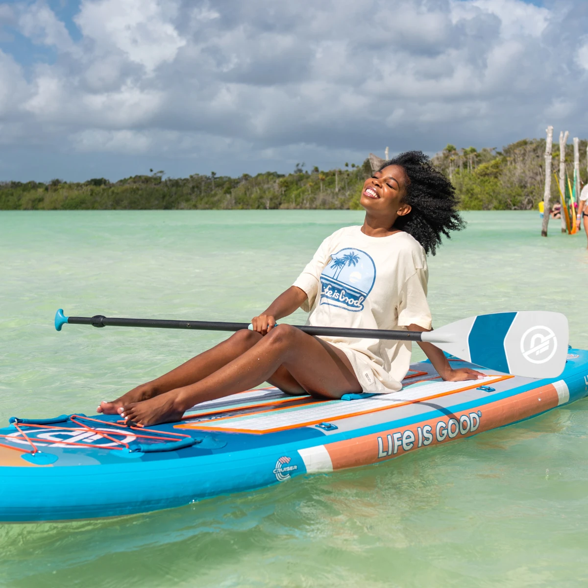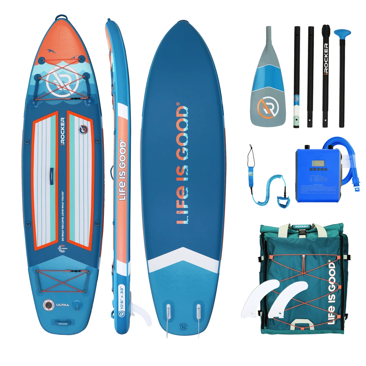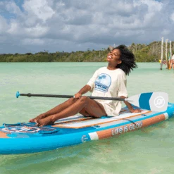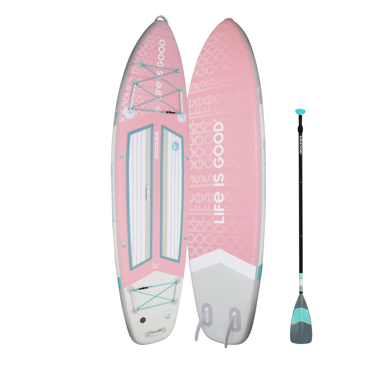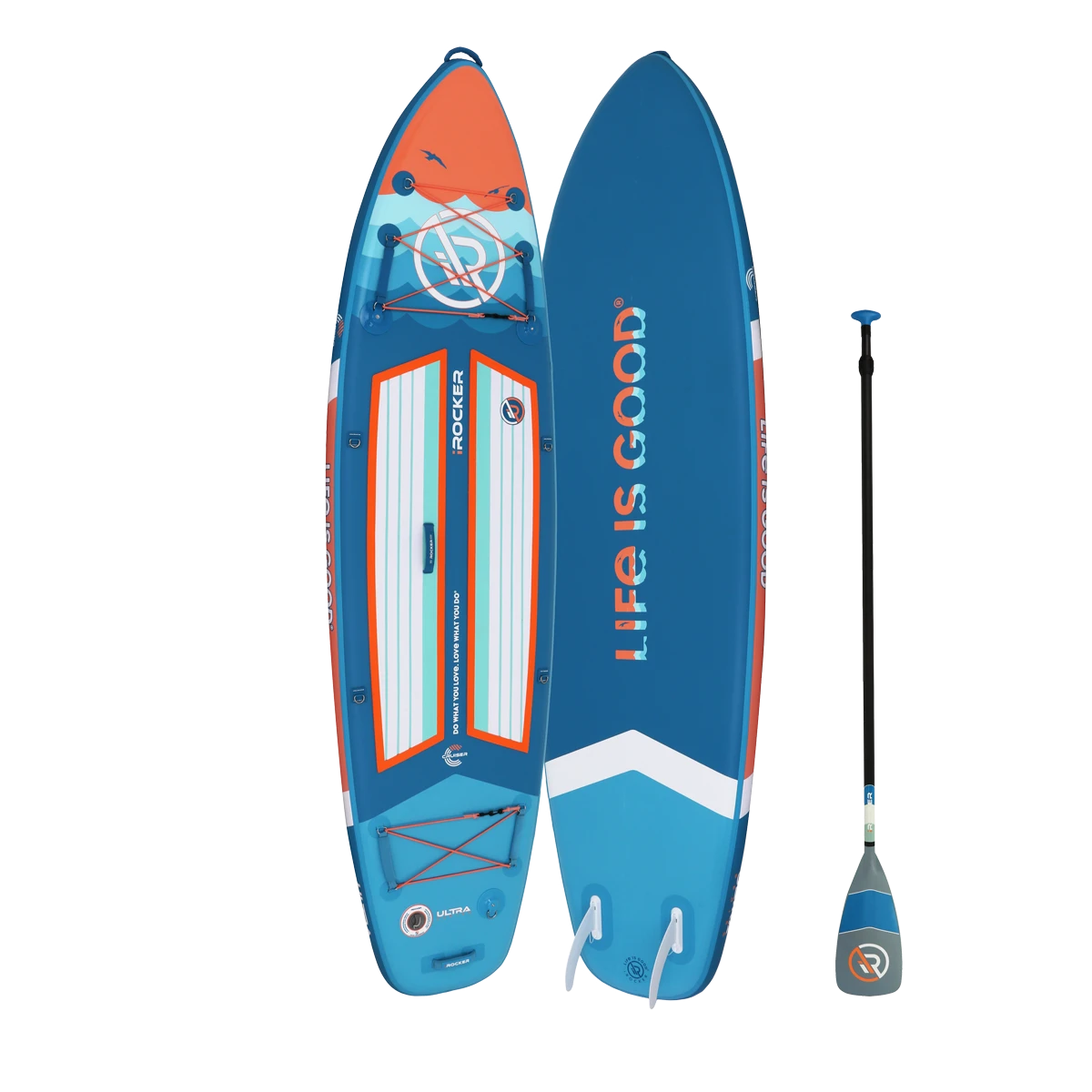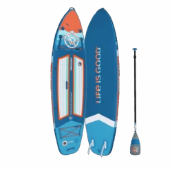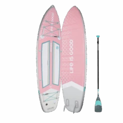 The Life is Good® by iROCKER CRUISER ULTRA™ inflatable SUP is designed for beginners, SUP yogis, families with children, and intermediate paddlers who prefer a slower ride. There is ample room for one rider and additional cargo or it’s spacious enough for two riders.